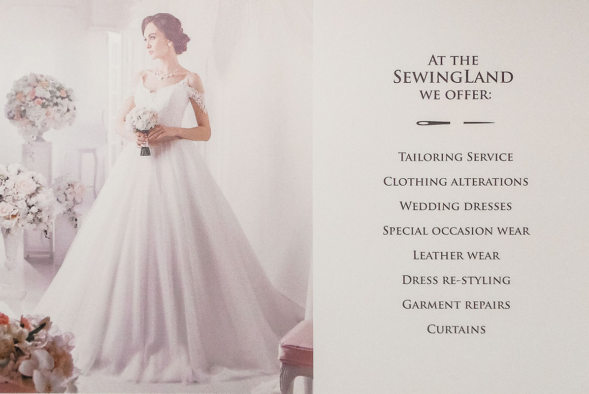 We restyle,resize,mend and customise bridal, formal and party wear, dresses, skirts, bluses and shirt, jeans, trousers, suits, jackets, coats, leather wear, uniforms and more so if you have an item of clothing that's in need of a quick fixthen come down to SewingLand today.